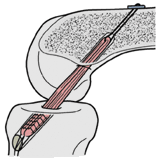 上記理由から手術適応は前十字靭帯損傷が最も多いのですが、十字靭帯の治療は自家組織(半腱様筋腱や膝蓋腱など)を用いて再建術が一般的です。手術は関節鏡を用いてできる限り低侵襲で行います。